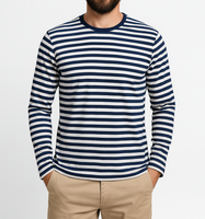 - Ponadczasowy marynarski styl — biało‑granatowe pasy zawsze wyglądają świeżo i pasują zarówno do jeansów, jak i chinosów.